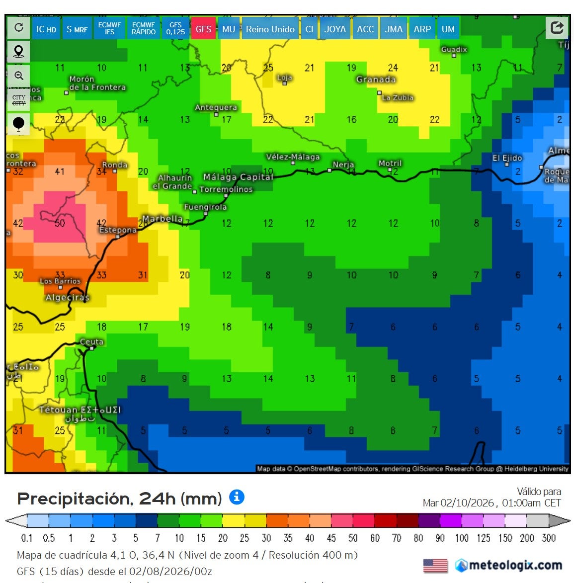 Ayer sábado en el aeropuerto de Málaga registró 26 mm y una racha de viento de 82 km/h; en la provincia, destacar Cortes de la Frontera con 50,4 mm, Aolandeire 49,4 mm y Gaucín 47,2 mm.