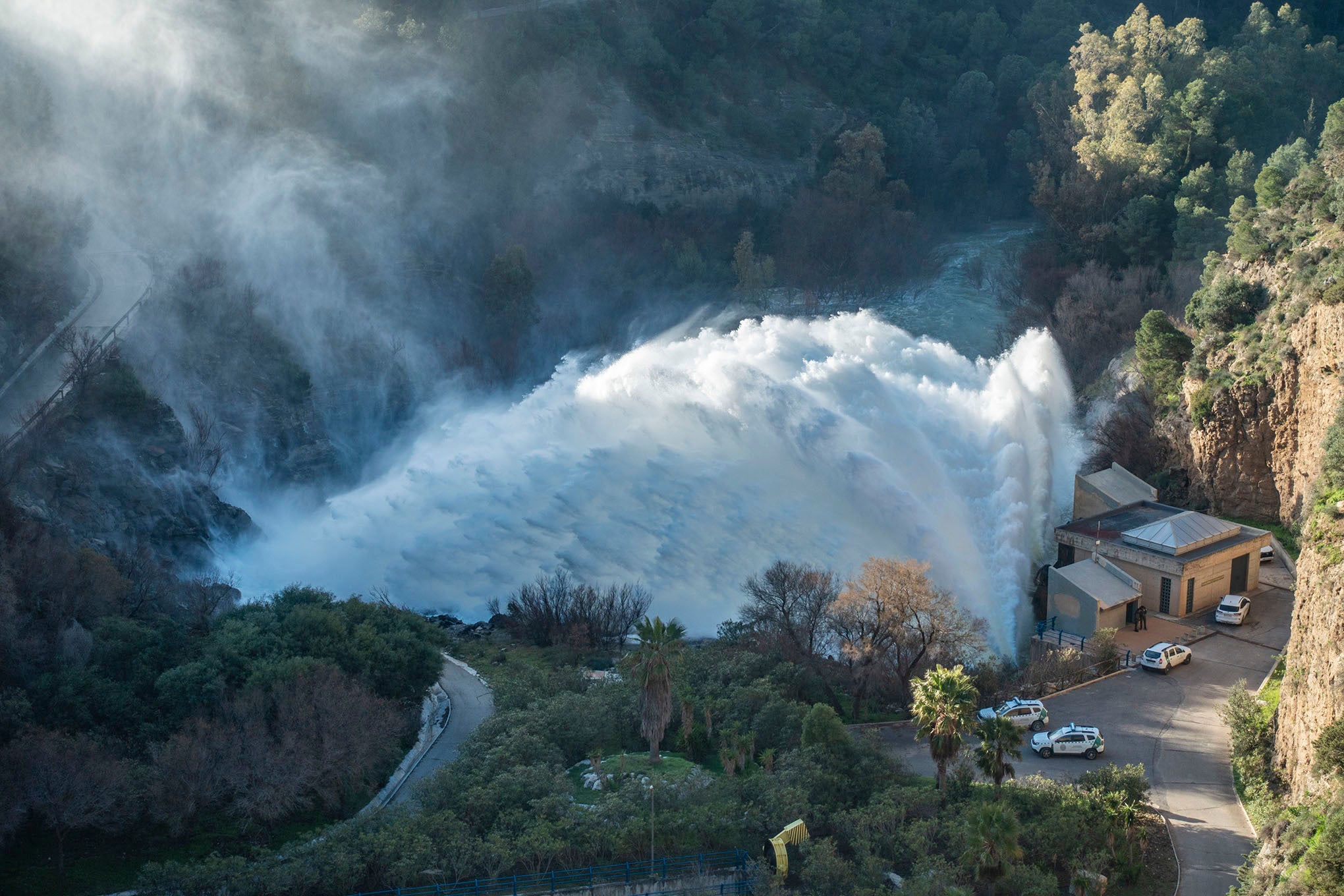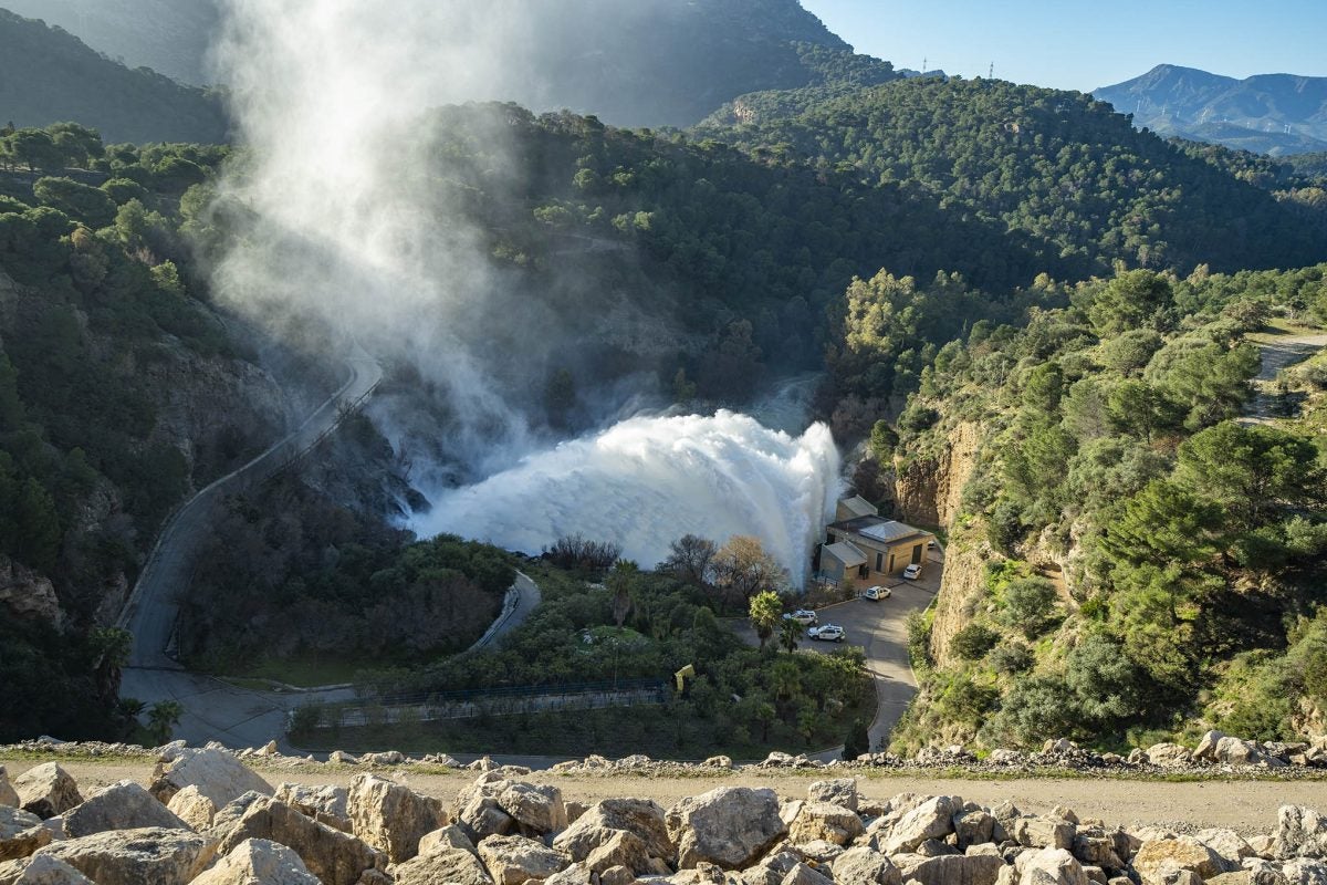 Ambos embalses llevan días abriendo las compuertas, los desagües de fondo. Las válvulas desaguan con espectacular presión hacia el cauce del Guadalhorce. Este viernes, ambos se situaban a mediodía por encima del 99% de su capacidad, con más de 152 y 124 hm3 respectivamente. Sólo en este sistema de pantanos hay agua para cinco años en la capital.