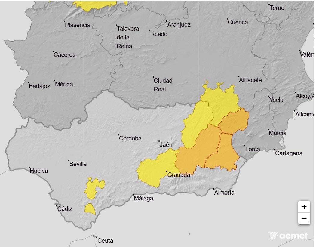 Aviso naranja en Guadix y Baza–Granada:Acumulación de nieve en 24 horas: 5 cm. Estas acumulaciones se esperan por encima de los 1300-400 metros. Cota de nieve en 1000-1200 metros.