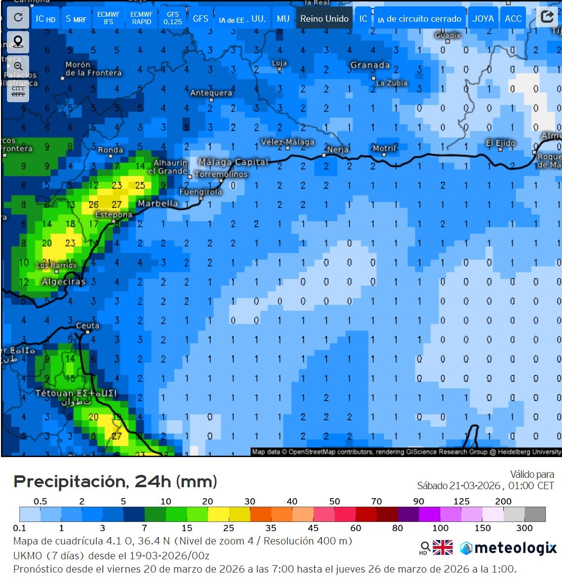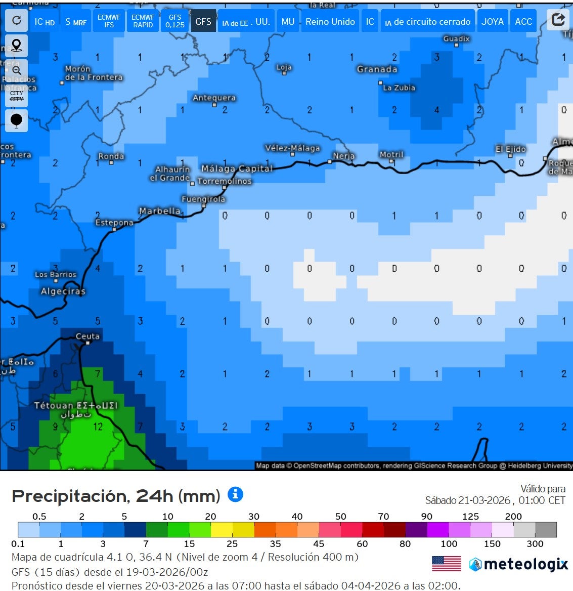 A partir de las seis o siete de la tarde aumenta la probabilidad, pero hay incertidumbre con algunos modelos en mesoescala en cuanto a la duración de las precipitaciones; algunos la finalizan entre las 21:30 y 22:00 horas. Lo que sí coinciden los modelos es que no se espera mucha precipitación; algunos incluso dan muy poca cosa. Mañana, cuando termine el día, sabremos qué modelo se ha aproximado más.