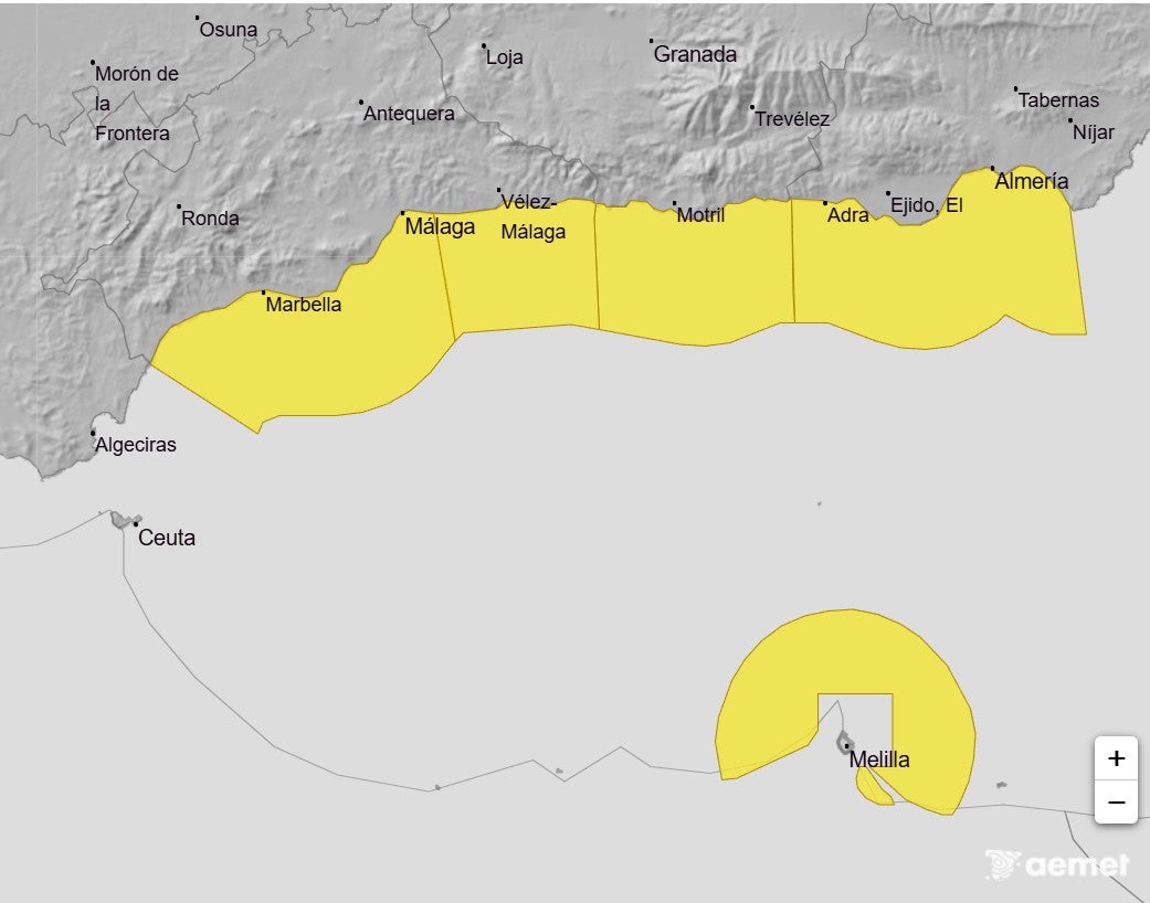 El viento soplará fuerte de poniente y terral de primavera, la Aemet activa el aviso por fenómenos costeros: Viento del oeste de 50 a 60 km/h (fuerza 7) y olas de 2 a 3 metros.