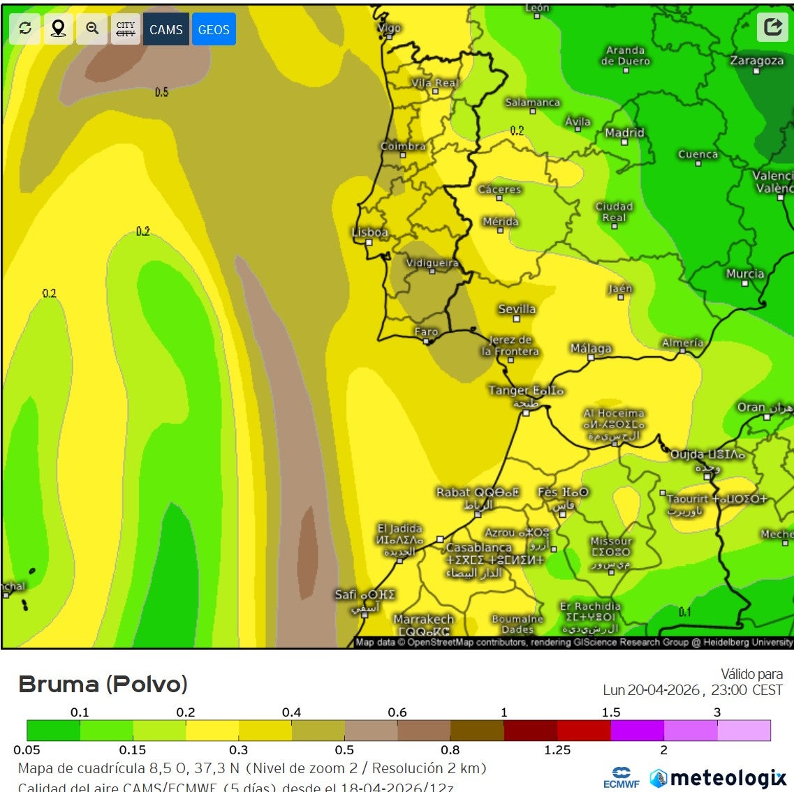 Buenos días, amigos de la meteo. Como he recibido comentarios preguntándome por la calima que anuncian algunos medios informativos, estad tranquilos, que la concentración de polvo en suspensión es muy baja para mañana lunes y el martes en Andalucía. Donde sí es alta es en las Canarias, incluso están en aviso amarillo. Además, los primeros días de la semana no se esperan lluvias, con lo cual no caerá barro en nuestra comunidad.