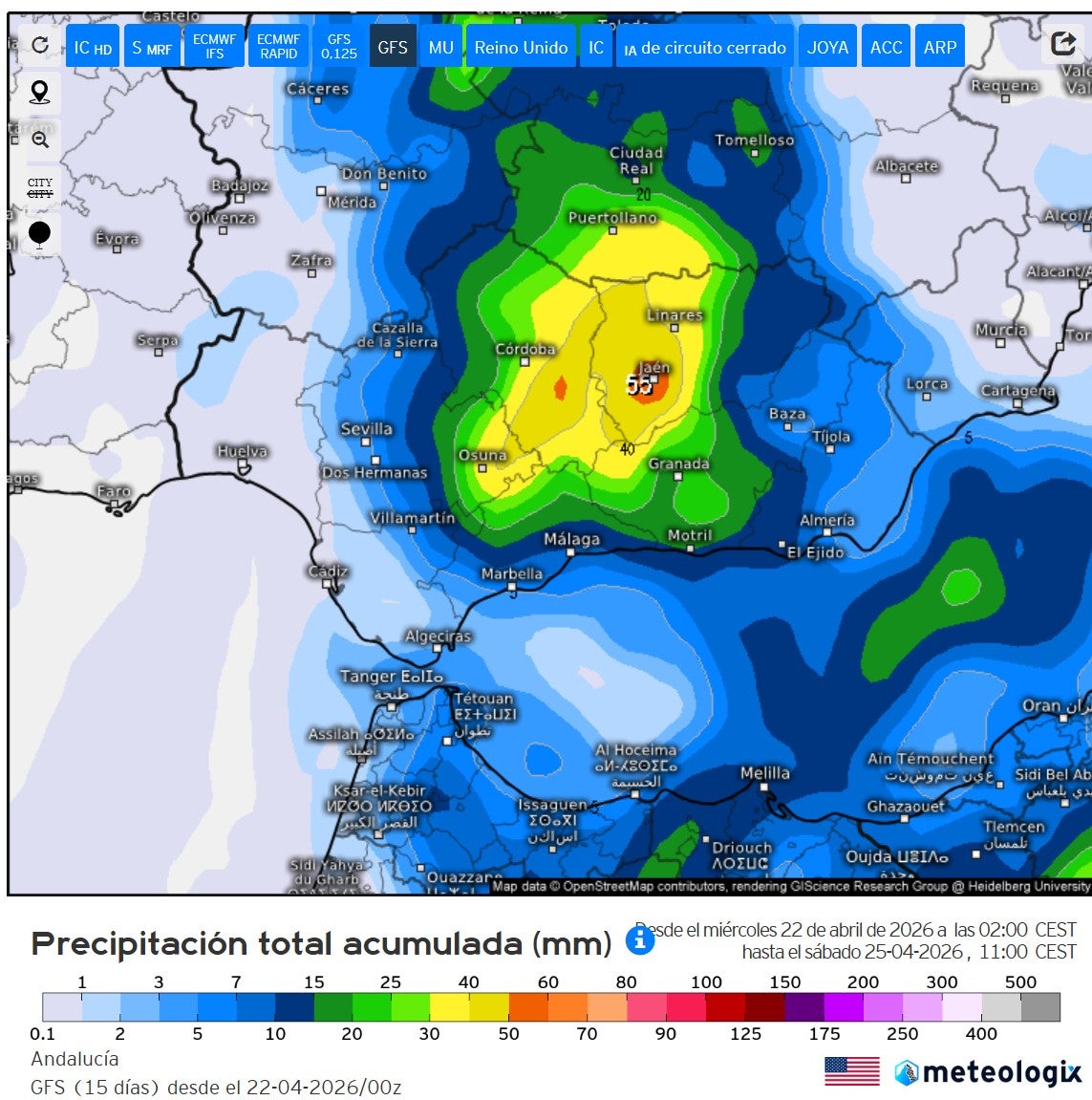El modelo americano la posiciona aquí y prevé estos probables acumulados entre el viernes y primera hora de la mañana del sábado.