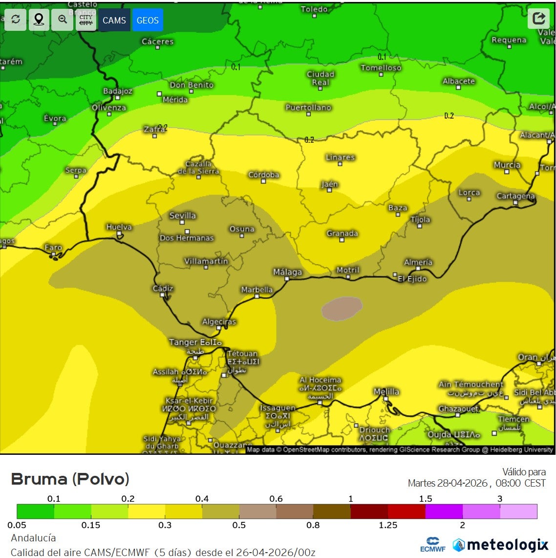 Os paso un mapa de concentración de polvo en suspensión previsto para mañana.