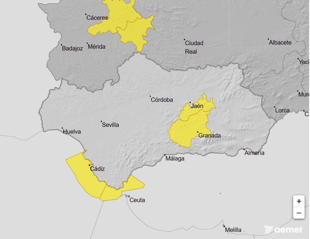 Mañana martes se activa el aviso amarillo por tormentas en la cuenca del Genil y sur de la provincia de Jaén, precipitación acumulada en una hora de 15 mm.  Sigue el aviso por fenómenos costeros en el Estrecho y litoral gaditano por viento de levante de 50 a 61 km/h (fuerza 7) al oeste de Tarifa y sur de Trafalgar.