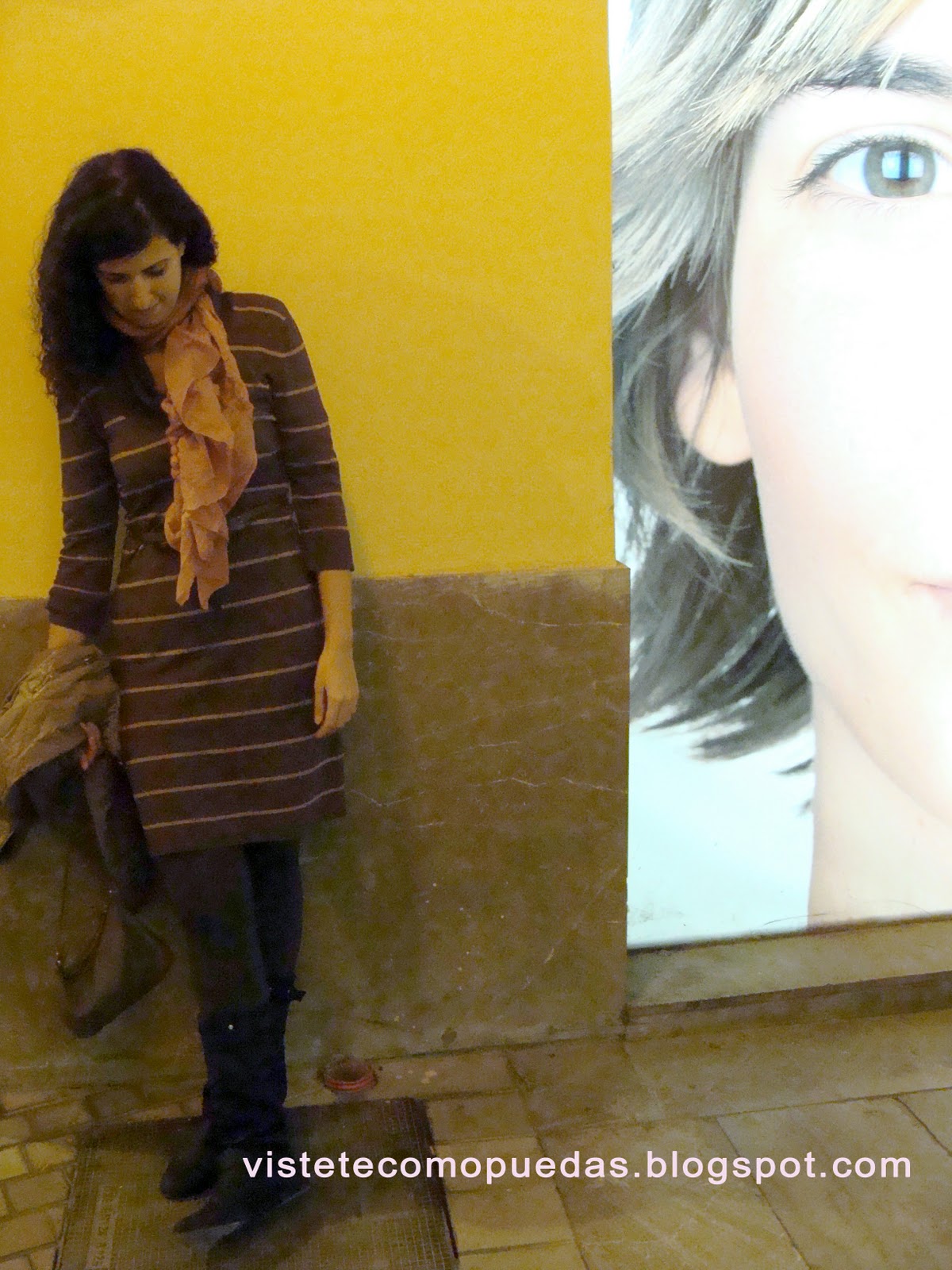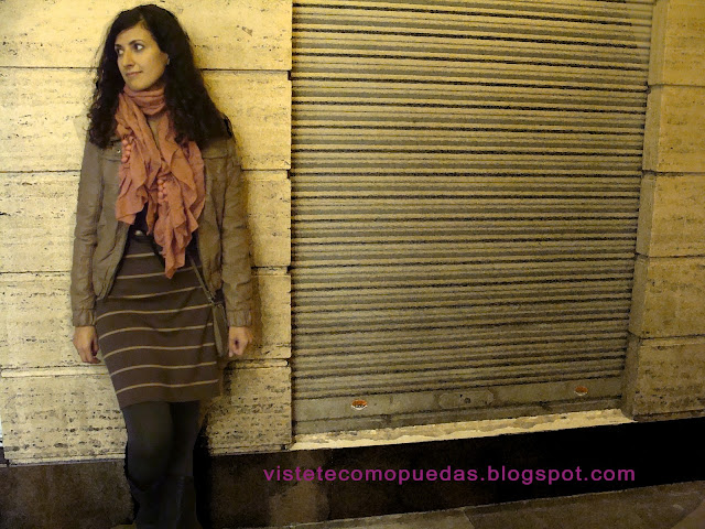 El vestido, de manga francesa y punto, es de la nueva temporada de Primark (14 euros). También está disponible en negro -el de la imagen es marrón con rayas en beige-. Foulard rosa también de Primark, así como los leggins y las botas. Bolso y cazadora de cuero de Blanco.