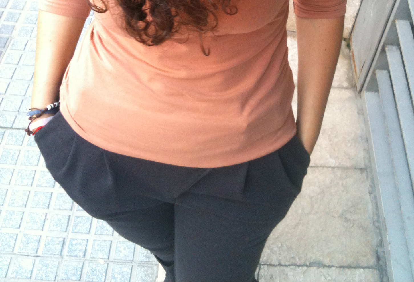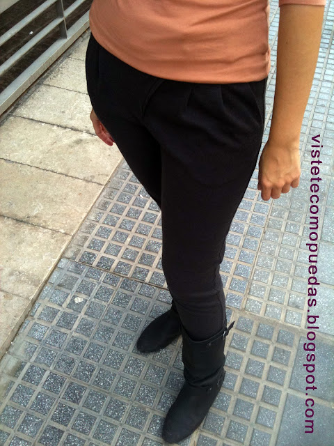 Digamos que la tela va hacia un lado. El pantalón es también calentito y, al ser tipo pinzas, creo que es fenomenal para ir arreglada a la vez que cómoda. En este caso, cómo iba vestida para dar un paseo yo lo he acompañado de botas, las que os mostré de Primark, pero con unos tacones creo que el look podría cambiar totalmente. El color, ya veís que es gris oscuro y creo que era el apropiado para un color como el que tiene la camiseta.