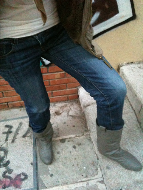 En fin, el resto del look, ya veis, una camiseta blanca básica, unos vaqueros, un pañuelo que me encanta de H&M (es de la temporada pasada, y lo utilizo bastante porque me gusta lo largo que es y la mezcla de colores que tiene -aunque en la foto no se ven todos-). Y, por último, unas botas, también del año pasado. Son de Blanco y supongo que muchas de vosotras también las tendréis porque se vendieron a muy buen precio, en varios colores, y las he visto muchísimo por la calle.