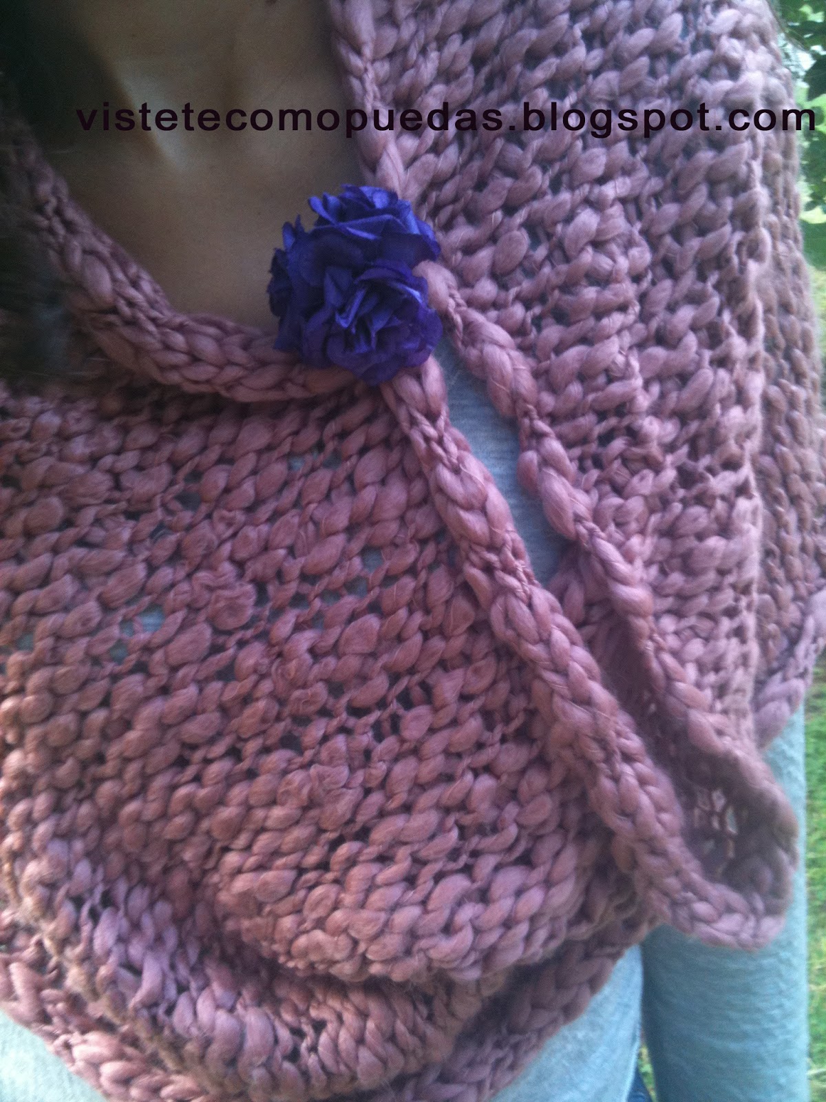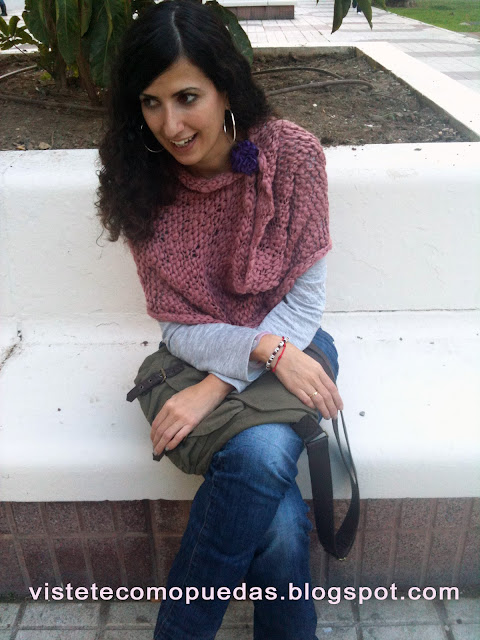 >En realidad no es una capa -como las que se llevan este otoño-, es mi propia adaptación. Una especie de bufanda de H&M cosida, es decir que no es realmente una bufanda. Una especie de lo que llaman braga -no me gusta nada llamarlo así- para el cuello. Es de una lana muy suave y agradable y de un color rosa muy bonito. Como al ponérmela se me caía un poco para abajo, le puse un broche que la cogiera un poco y, así tenía un aire más romántico. Además, debajo llevaba una camiseta nueva -otro de los regalos de cumple- de Mango, que también tiene un tacto muy agradable y es bastante cálida, además de cómoda.