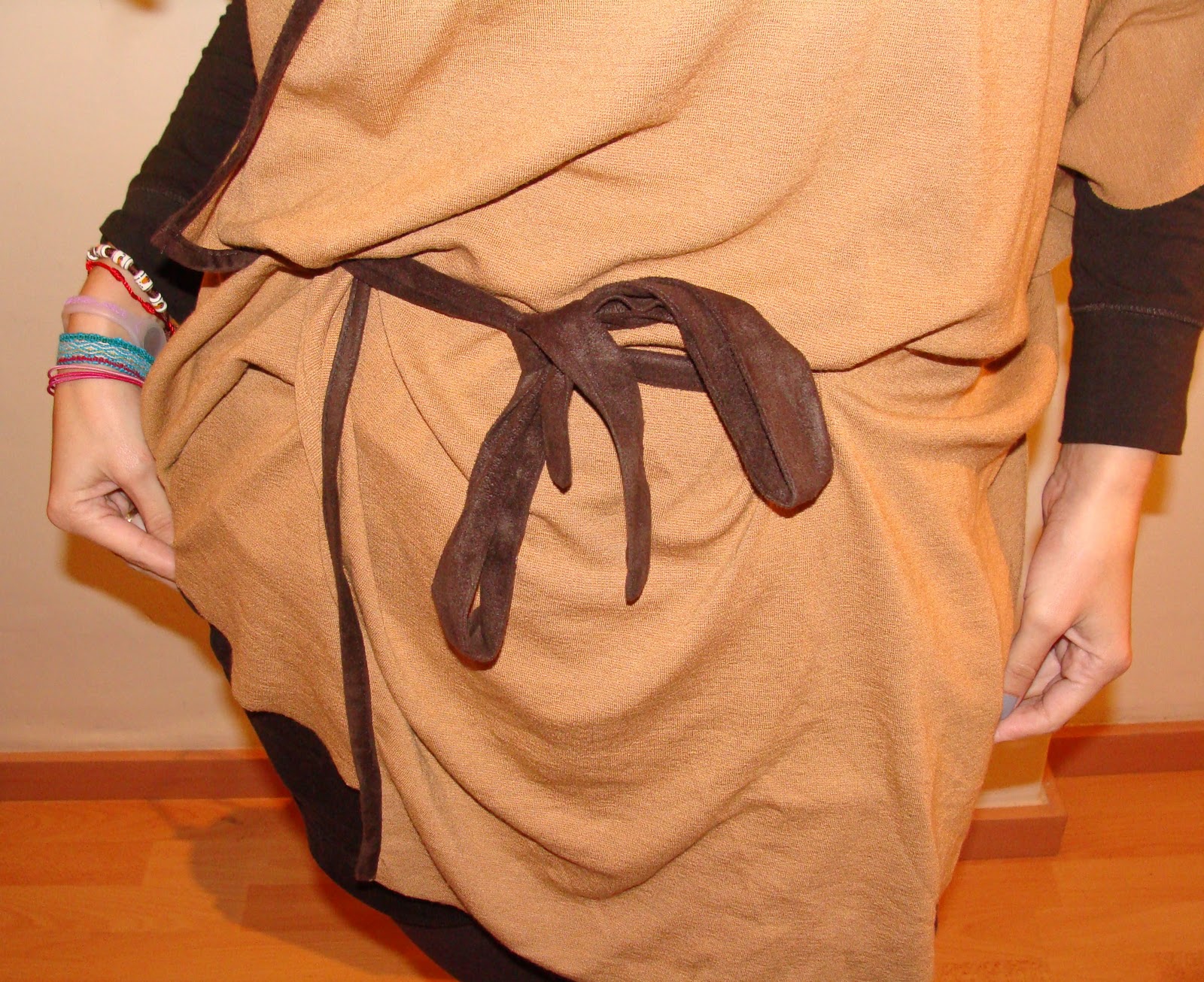 – En esta última foto se observa a la izquierda, por encima del nudo un pequeño piquito que queda como suelto, al aire, parece que le faltara un botón o un clip para sujetarlo al resto de la capa. Da igual que lo ate a un lado o a otro que siempre queda un pico, así que eso es algo que no me termina de convencer.