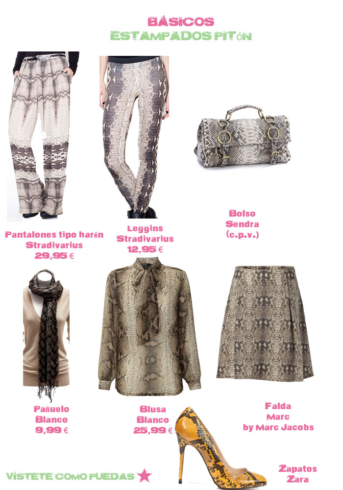 >No me convence demasiado, pero oye, ¿Y quién soy yo para discutir lo que la moda dicta?, así que aquí va una nueva tanda de básicos. Esta temporada parece “obligado” tener unos buenos pantalones con estampado de serpiente en el armario, o cualquier otra prenda, aunque en mi armario no veréis nada con este animal print (pero ya sabéis, nunca digas nunca).