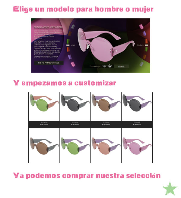 When I heard that Emporio Armani to celebrate its 30 anniversary offers its first 1030 online customers the ability to customize your sunglasses, I thought I would give a little more game. However, there are only two models that designers can play: One for them and another for us. And personally, the model for women does not convince me at all. But I wanted to share with you ‘s the news for you if you had heard yet.