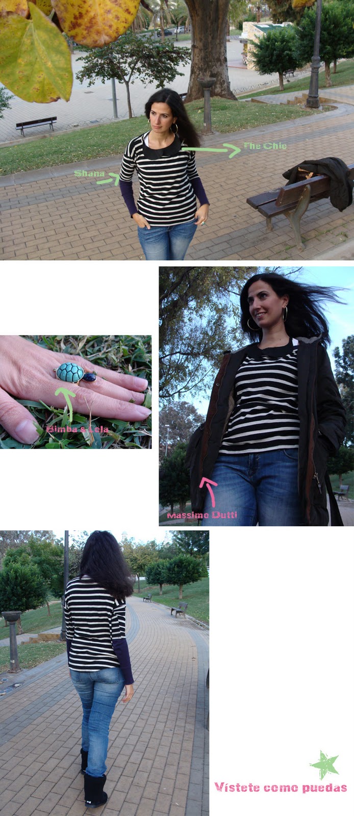 Soy bastante friolera, así que excepto porque es demasiado finito para este tiempo, este jersey me parece perfecto!. Me costó bien poquito -porque es de Shana-, me gusta que sea más largo por detrás, el aire que le dan las rayas en esos tonos, y la manga francesa. También me gusta el cuello que tiene, aunque en este caso veréis que he superpuesto un cuello bebé que podréis encontrar