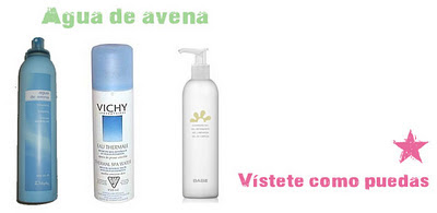 Some time ago that I discovered water oats and, although I do not use regularly, her believe that a good recommendation. Oatmeal water has cosmetic properties to calm the skin after suffering irritation or exposure to the Sun. It also serves as a tonic and as a base for makeup, even help fix it.In addition, it has hydrating, relaxing properties and acts as a protective barrier against external aggression. In this way it also helps cleanse the skin. You can use on all types of skin, from dry to fat. You can find them in pharmacies and supermarkets, since different brands marketed. Even I have found on the Internet some recipes to make them at home, so if you urge already you know that you just have to look for them.